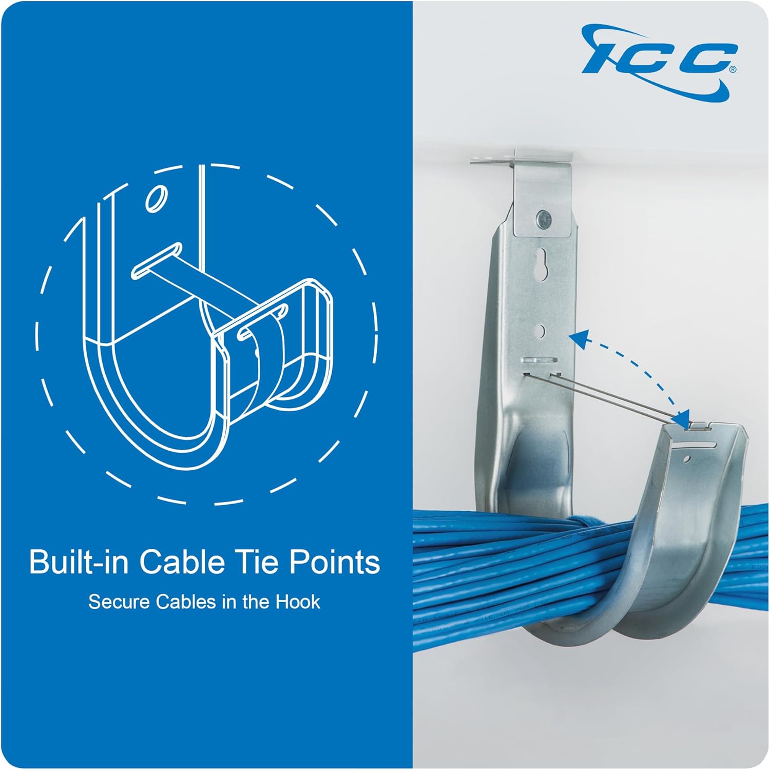 - EFFICIENT OVERHEAD CABLE MANAGEMENT - ICC Ceiling Mount J-Hooks provides a practical solution for organizing and securing cables overhead. With a practical design and function, each one helps prevent tangled wires and keep cables neatly routed along ceilings, walls, or beams, ensuring a clean and organized space.