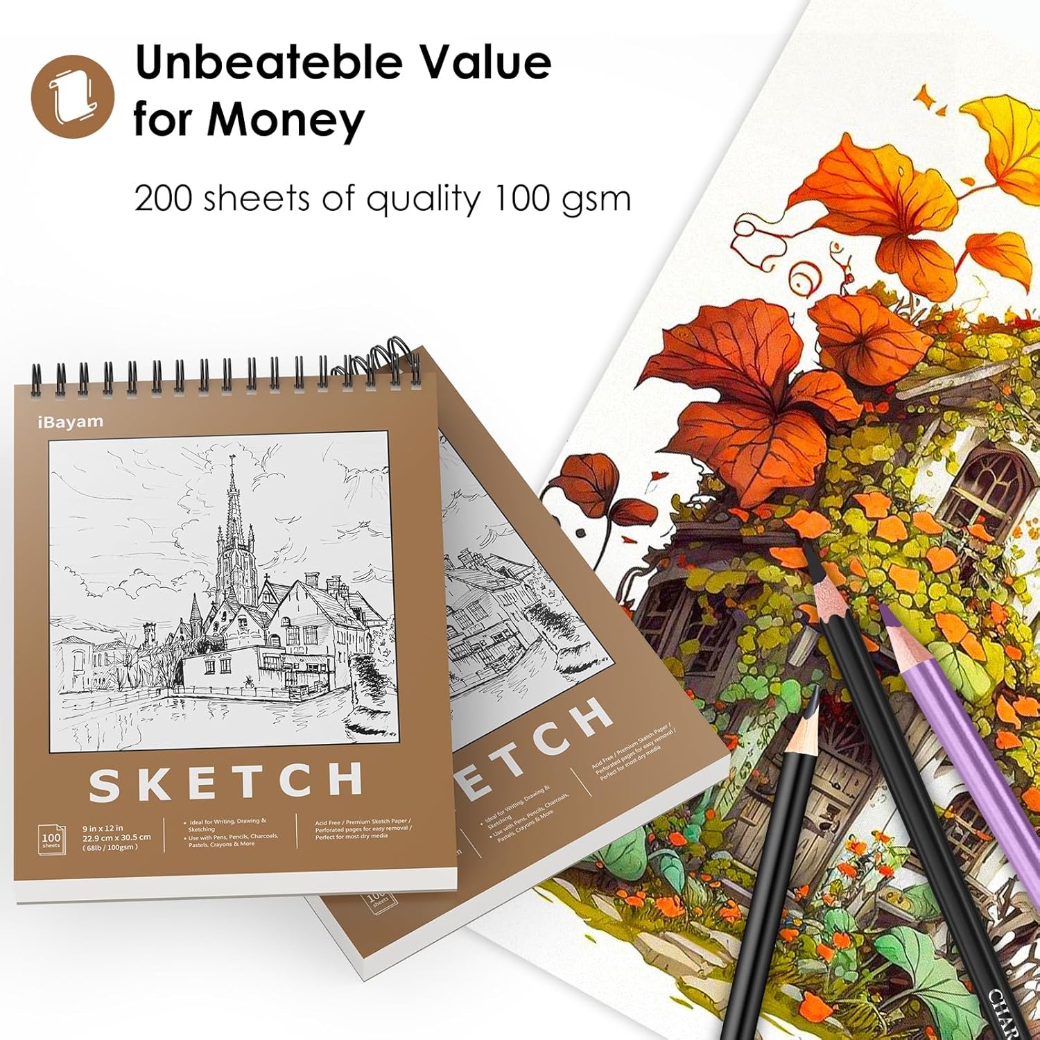 iBayam 9" x 12" Sketch Book Set, 2-Pack Spiral Bound Drawing Paper, 200 Sheets (68lb/100gsm) Premium Sketchbook, Acid-Free Art Drawing Painting Sketching Pad Supplies for Kids, Teens, Adults, Artists