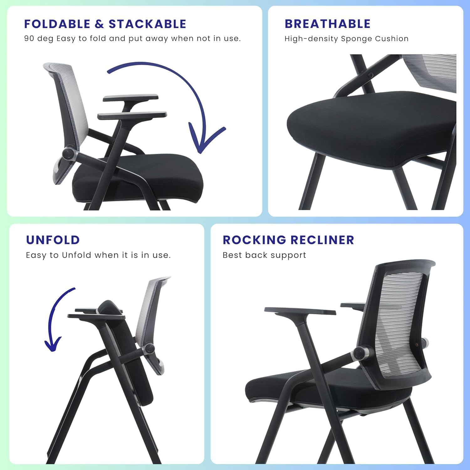 - Stackable conference room chairs:Saves space and can be quickly folded up when not in use. This ergonomic office desk chair is perfect for any space, including conference rooms, living rooms, home offices, schools, and lobbies