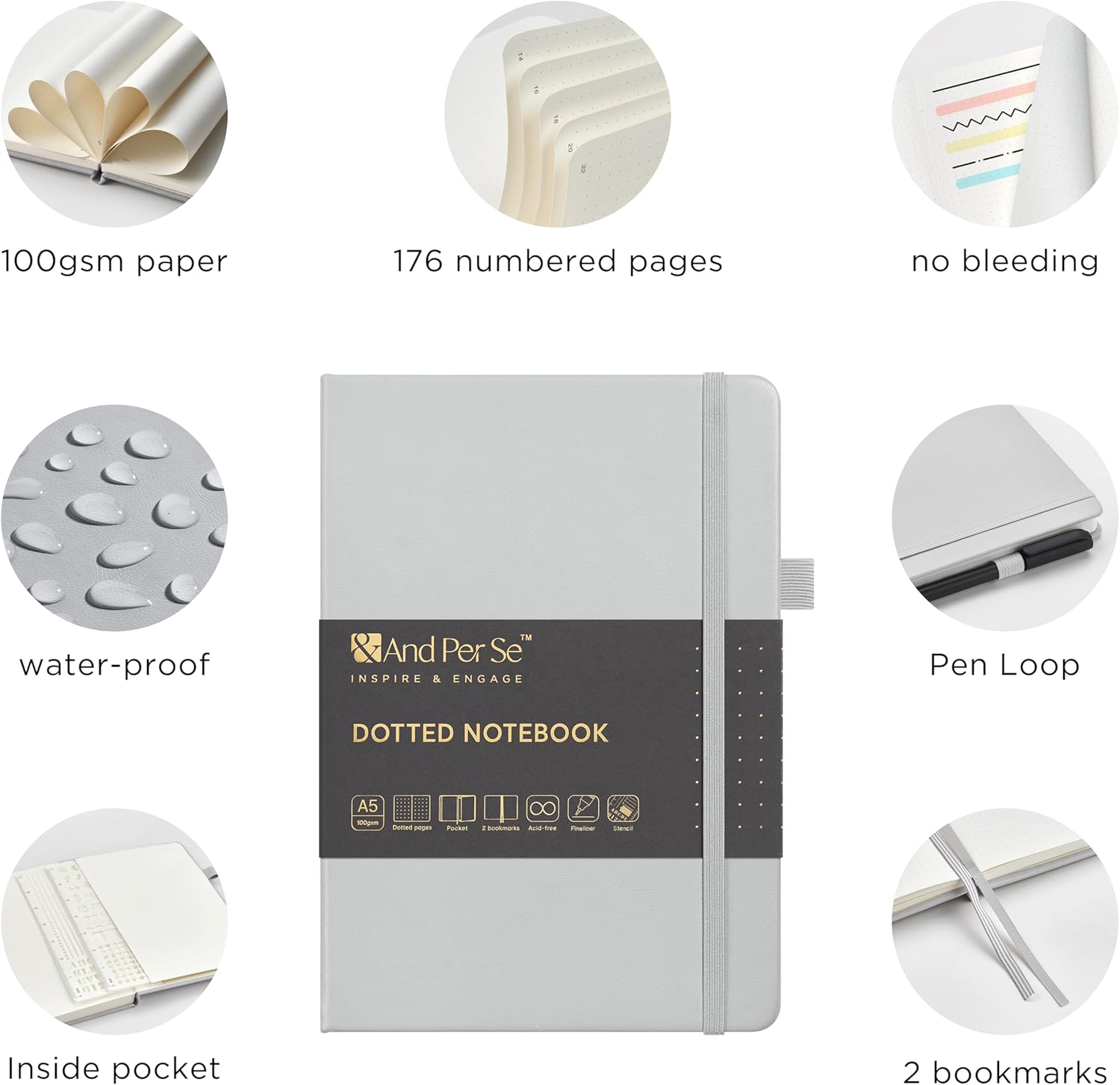 &And Per Se Bullet Dotted Journal Notebook, A5 Leather Hardcover, 176 Numbered Pages 100GSM Thick Dotted Paper, 2 Sheets of Stencils Included - 5.7'' x 8'' (Grey)