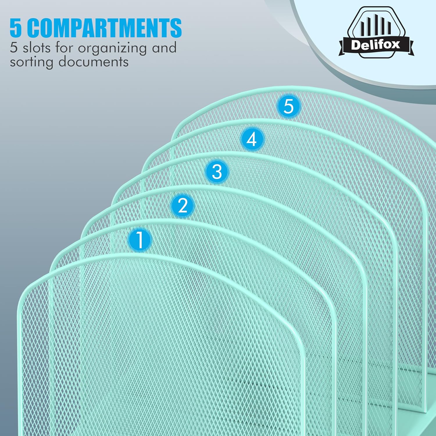- ▶ SUFFICIENT SPACE FOR STORAGE. Delifox 5-compartment desktop file organizer is large enough to hold and classify many document or papers so as to eliminate worry of document run-off and keep track of files, folders, and other important papers