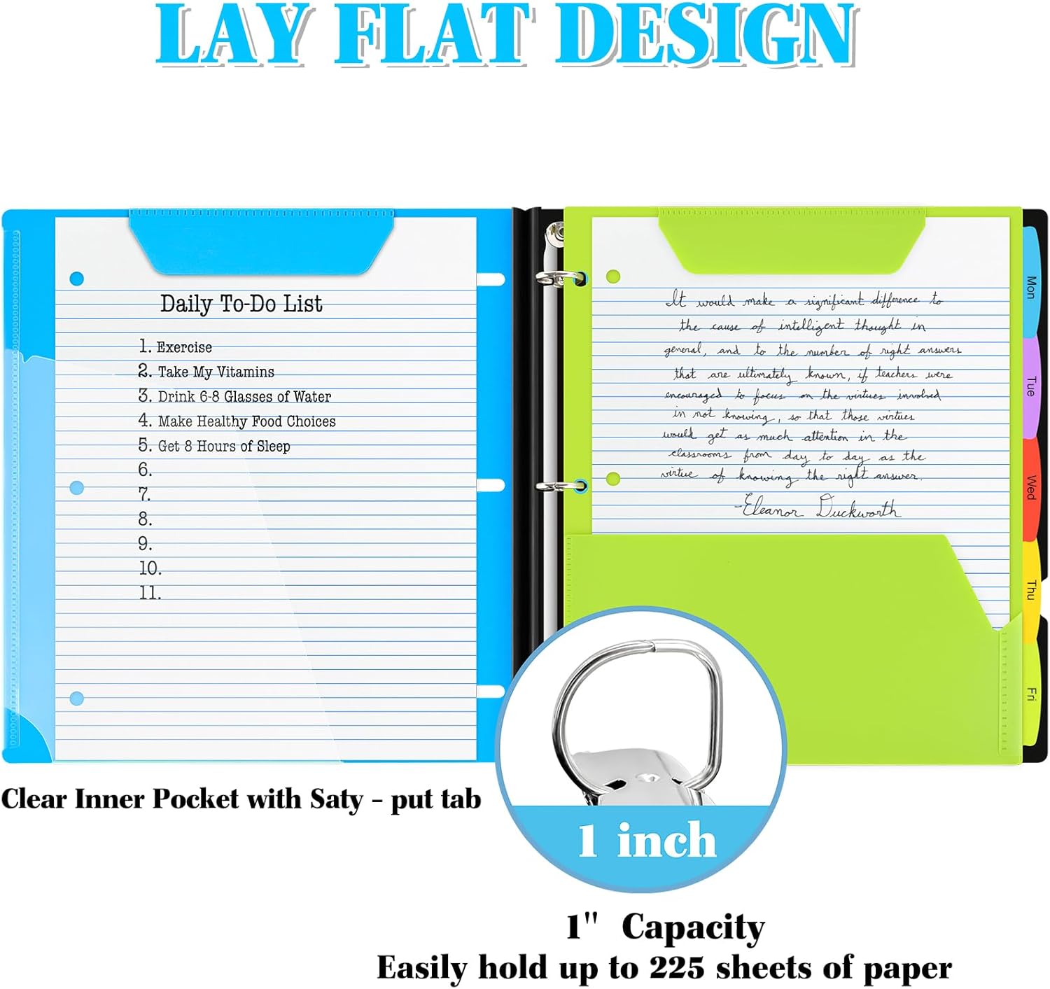 - Foldable Front Cover design : The INFUN Telescoping 3-Ring Binder features a foldable front cover design, allowing it to unfold fully and lie flat on the desktop, providing a smooth and level writing surface. Additionally, the foldable front cover can be conveniently folded back, saving valuable desktop space and serving as a temporary clipboard, offering a versatile workspace tailored to your needs.