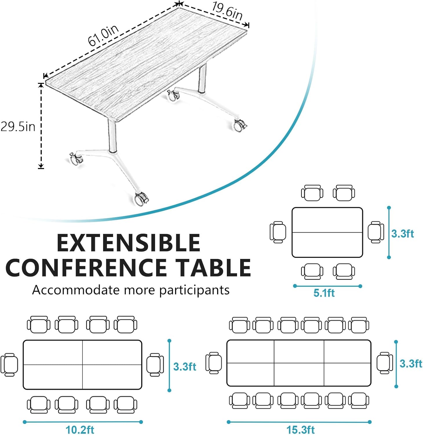 - Conference table on wheels: Our conference table is equipped with 360° casters. You can easily push the table to any position in the room and flexibly adjust the meeting grouping. Lock the brakes on the casters and the table will remain stable