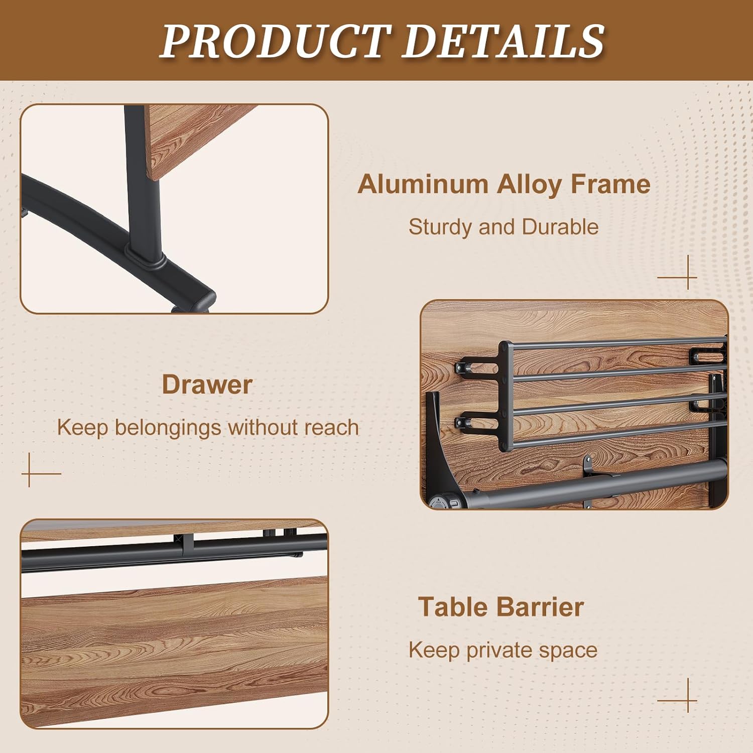 - ăAluminum Frame and Sturdy DesktopăConstructed with aluminum alloy, the frame of this folding conference table is very strong and durable. Besides, the desktop of our seminar table resists liquids, stains, and scratches which makes our mobile training table easy to clean. Although you use it for a long time, its appearance is still beautiful as a new one.